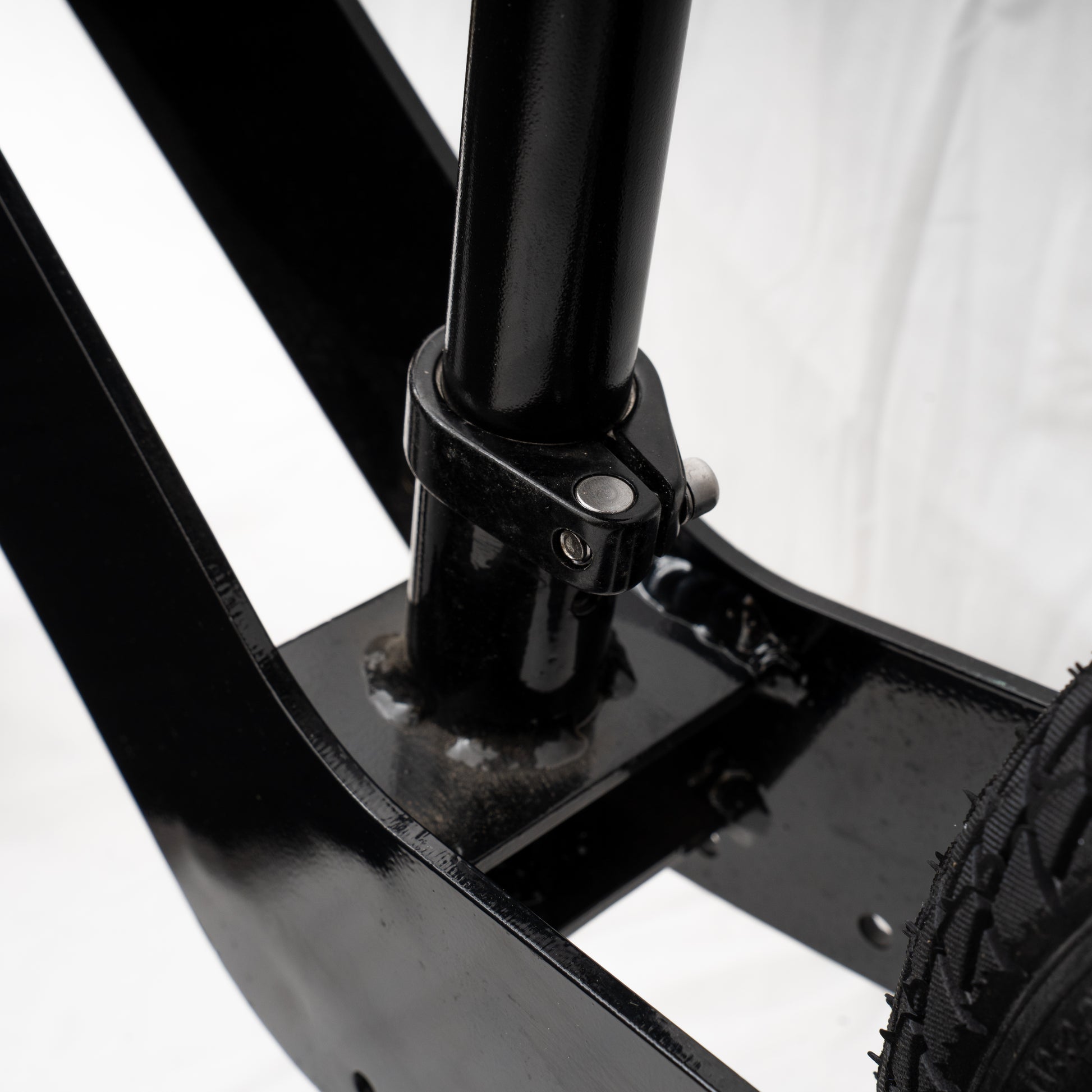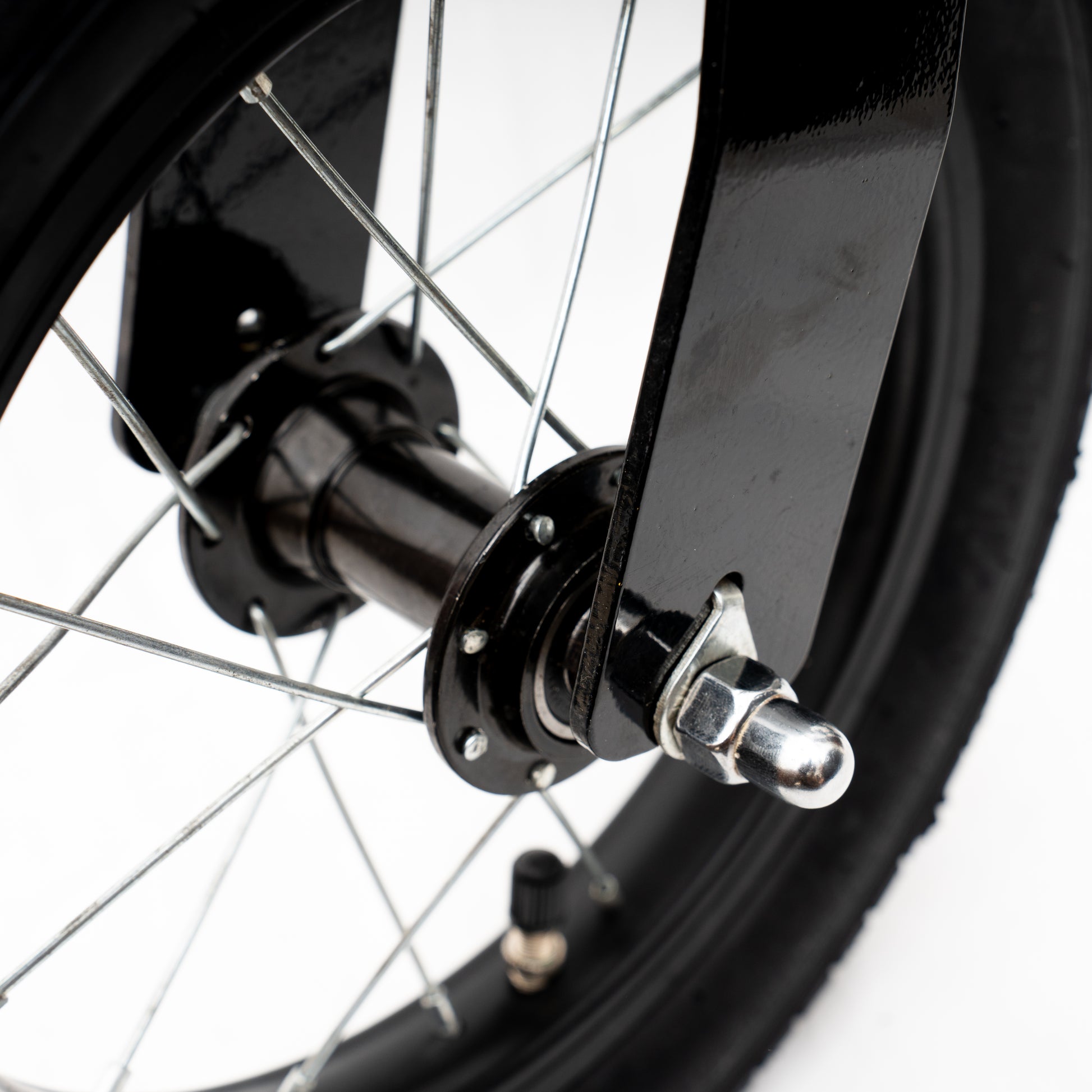 - Sealed bearing Al hubs, spoked wheel, pneumatic tyre set up for confident and comfortable riding indoors and outdoors.